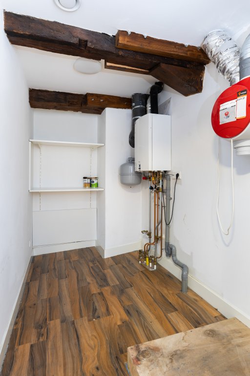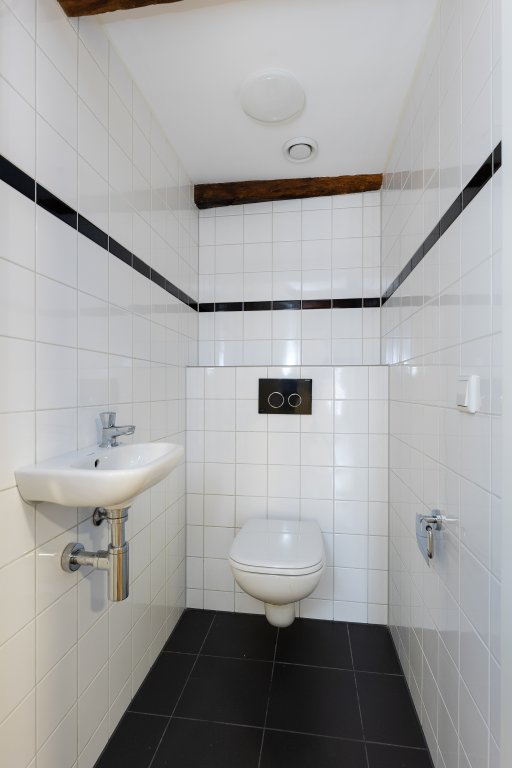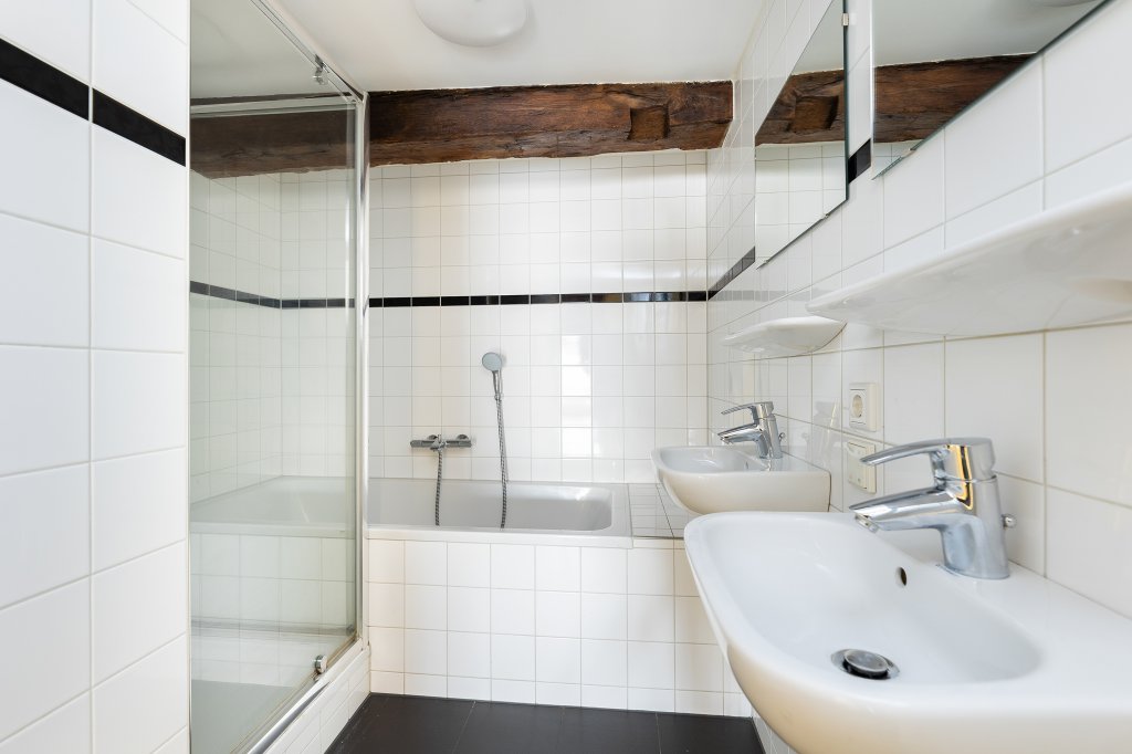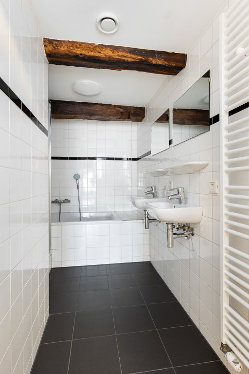 Je stapt binnen in een royale hal – groter dan je misschien zou verwachten. Links ontdek je de moderne badkamer, voorzien van een heerlijk ligbad, twee wastafels, een ruime douche en een designradiator. De rustige, neutrale afwerking maakt dit een plek waar je echt kunt ontspannen. Het toilet bevindt zich apart, en in de technische ruimte ernaast vind je alles netjes weggewerkt: de cv-ketel, de aansluitingen voor wasmachine en droger.