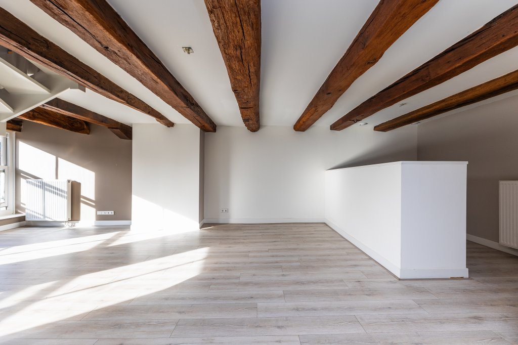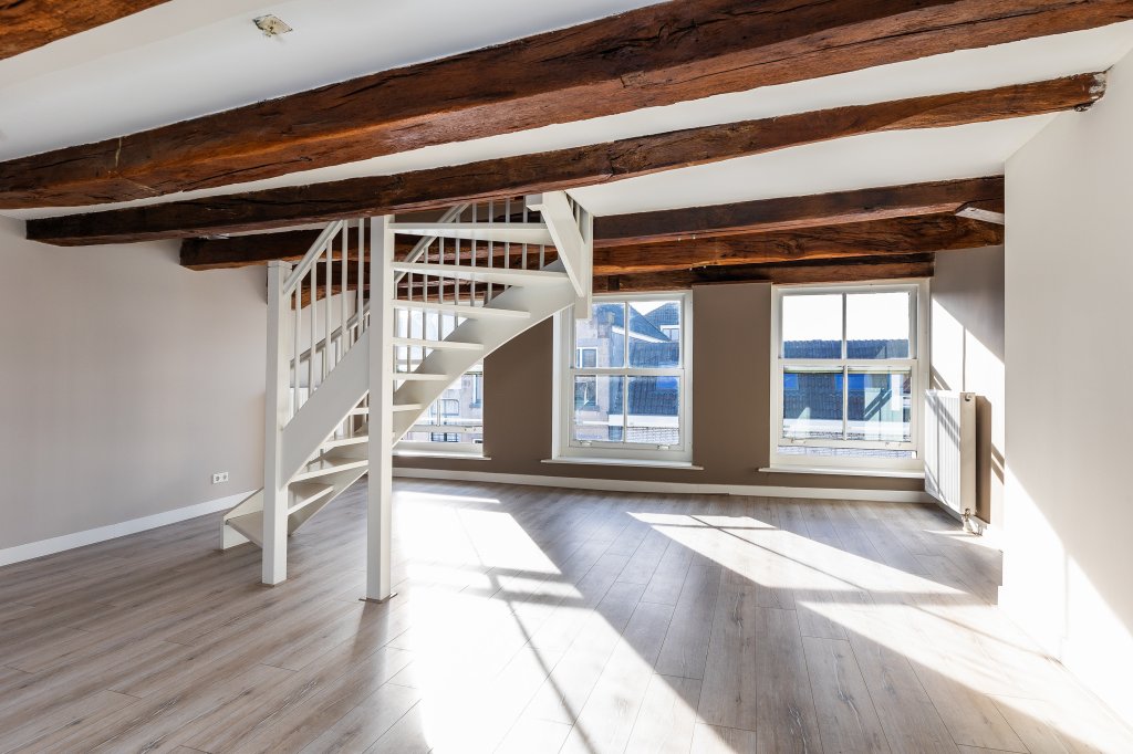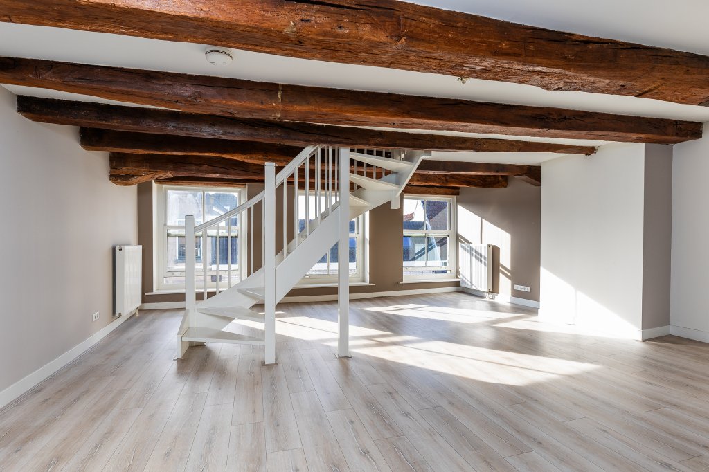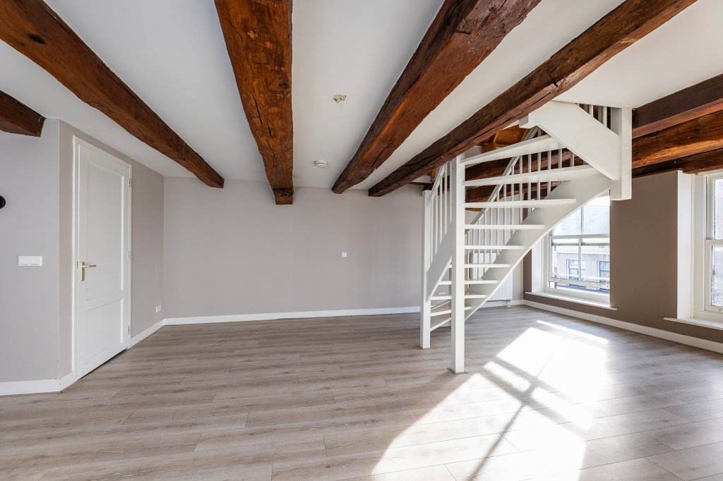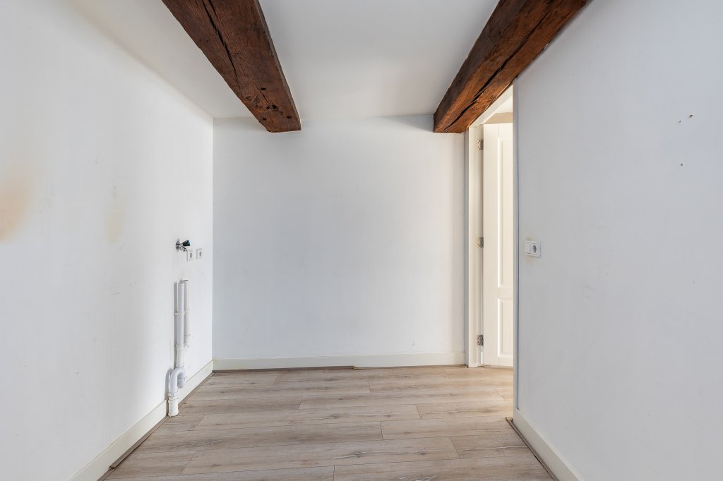 Je stapt binnen in een halletje met toilet. Vervolgens kom je in de lichte woonkamer met open keuken. Hier vallen direct de prachtige houten balken en het hoge plafond op, karaktervolle details die deze ruimte een warme en authentieke uitstraling geven. De woonkamer biedt bovendien uitzicht over de Oudestraat, waardoor je midden in de levendige binnenstad woont, maar toch een fijne rust ervaart zodra je binnen bent.