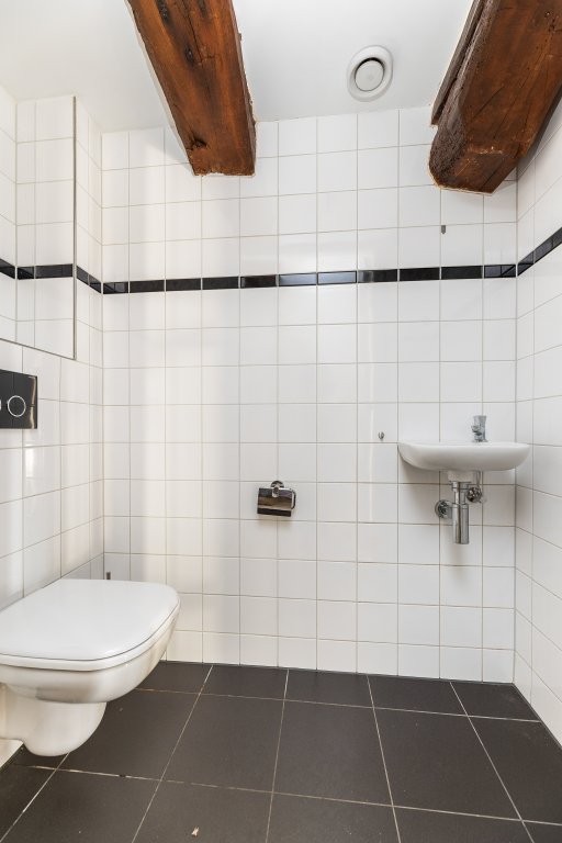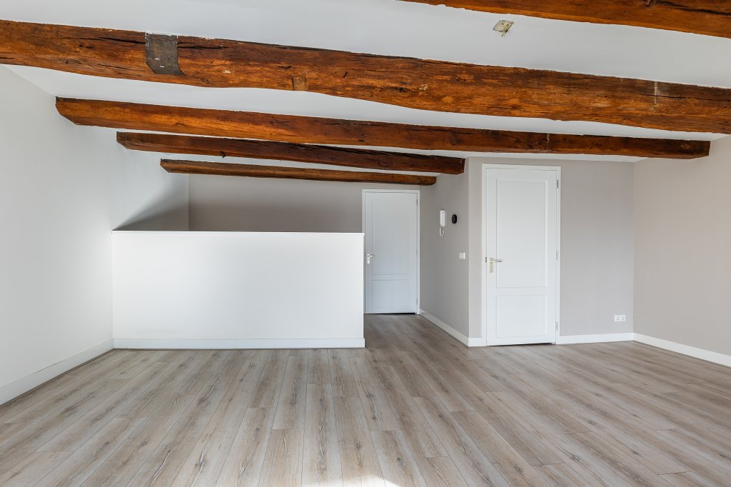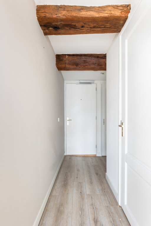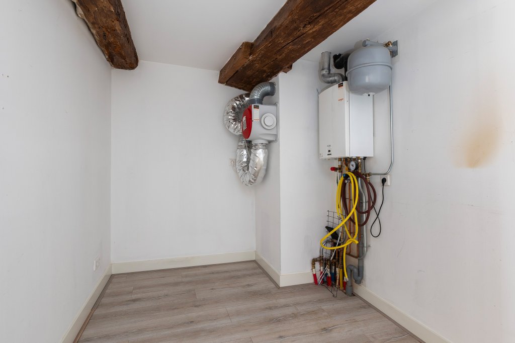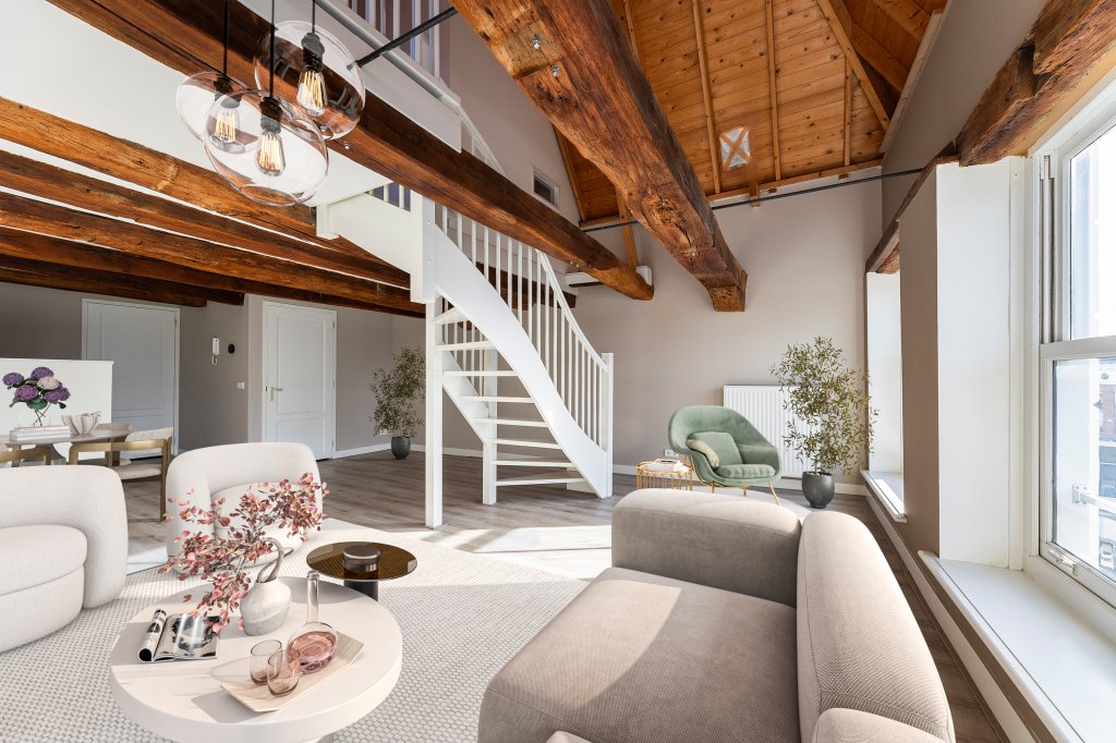 Je stapt binnen in een halletje met toilet. Vervolgens kom je in de lichte woonkamer met open keuken. Hier vallen direct de prachtige houten balken en het hoge plafond op, karaktervolle details die deze ruimte een warme en authentieke uitstraling geven. De woonkamer biedt bovendien uitzicht over de Oudestraat, waardoor je midden in de levendige binnenstad woont, maar toch een fijne rust ervaart zodra je binnen bent.