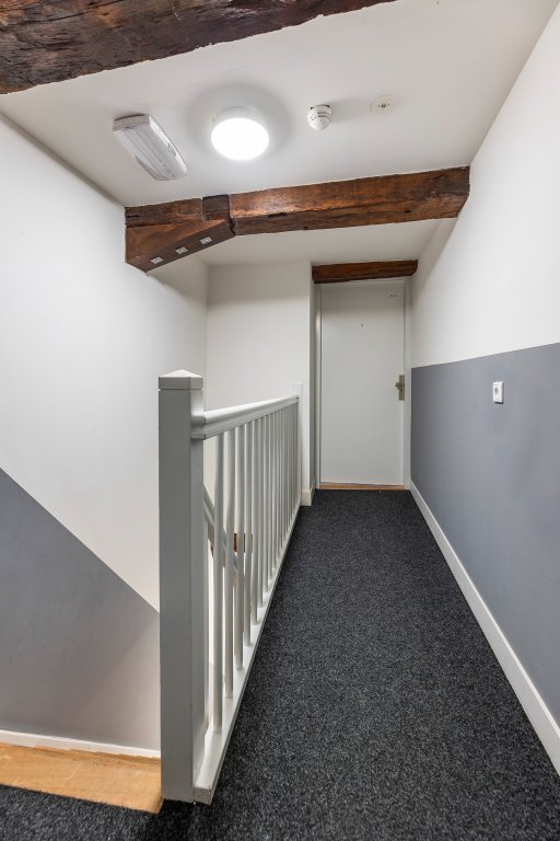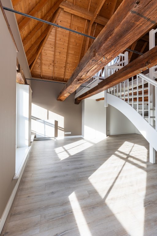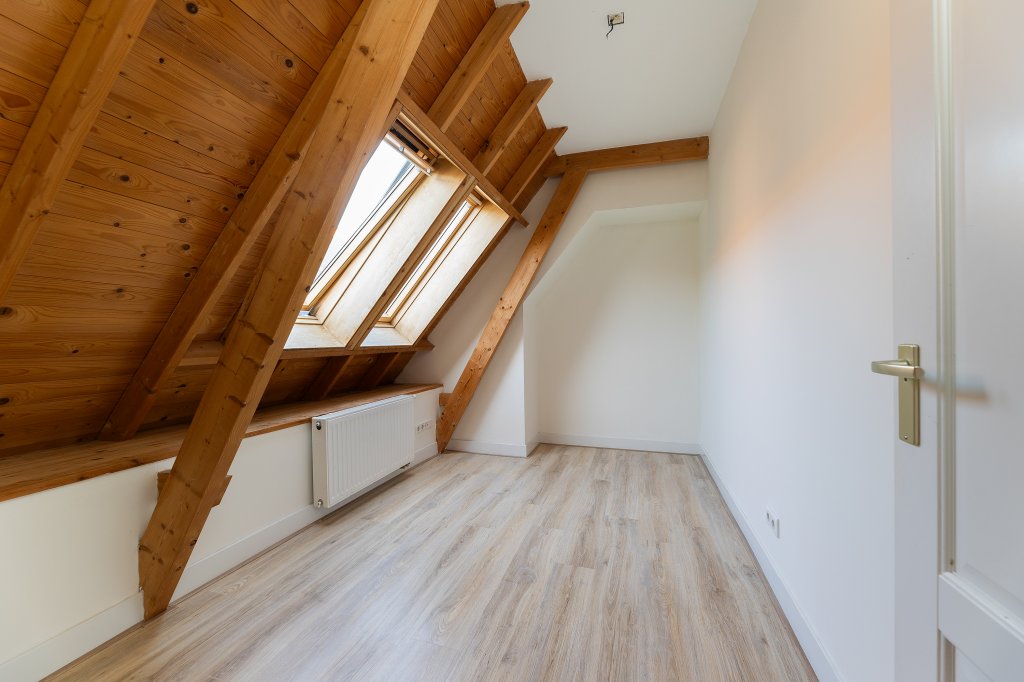 De trap in de woonkamer leidt naar de bovenverdieping. Hier ontvouwt zich een royale vide — een ideale plek voor een werkhoek of leesplek. Verder vind je op deze verdieping twee slaapkamers en een nette badkamer met ligbad, aparte douche en wastafel. De houten details en schuine plafonds geven ook hier dat kenmerkende, sfeervolle karakter van dit monumentale pand.