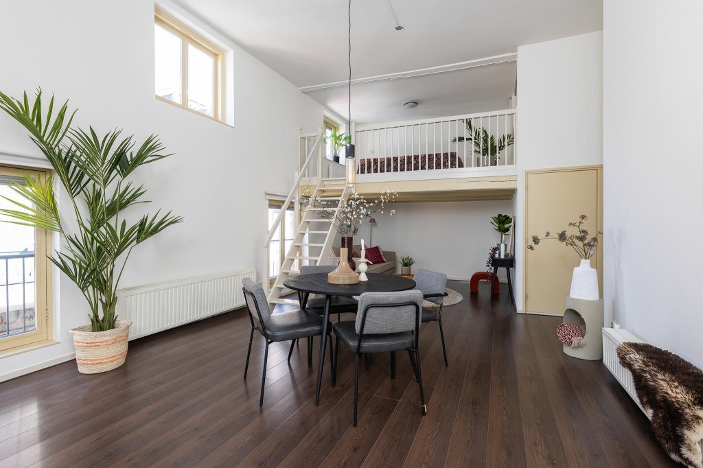 Via de gezamenlijke hal bereik je de voordeur op de eerste verdieping, waarna je binnenkomt in de royale woonkeuken. Met zijn prachtige hoge plafonds en overvloed aan natuurlijk licht is deze ruimte de ideale plek om te koken, dineren en ontspannen. De moderne open keuken is slim ingedeeld en is voorzien van alle gemakken: een gaskookplaat met afzuigkap, combi-oven, koelkast met diepvriesvak en vaatwasser.
