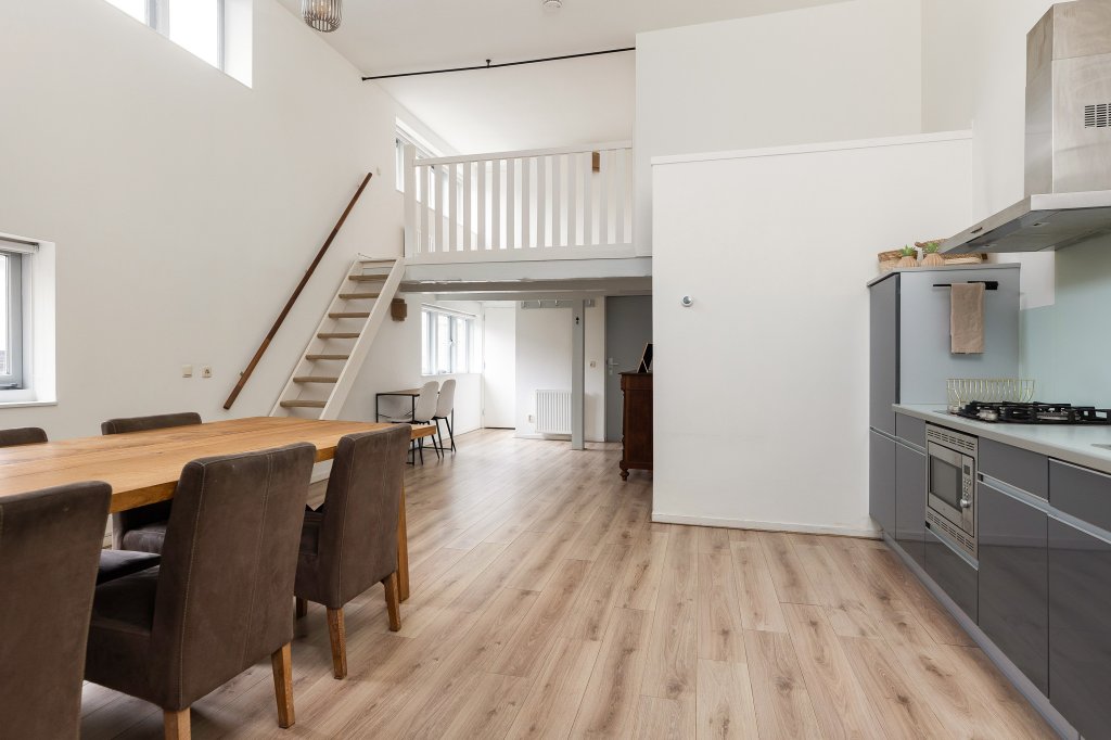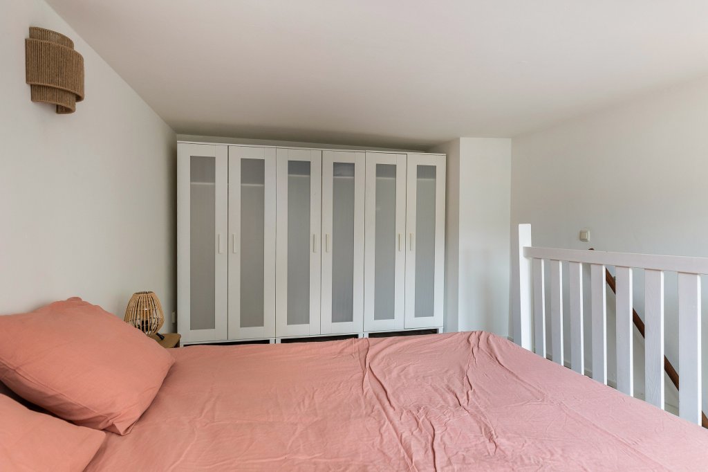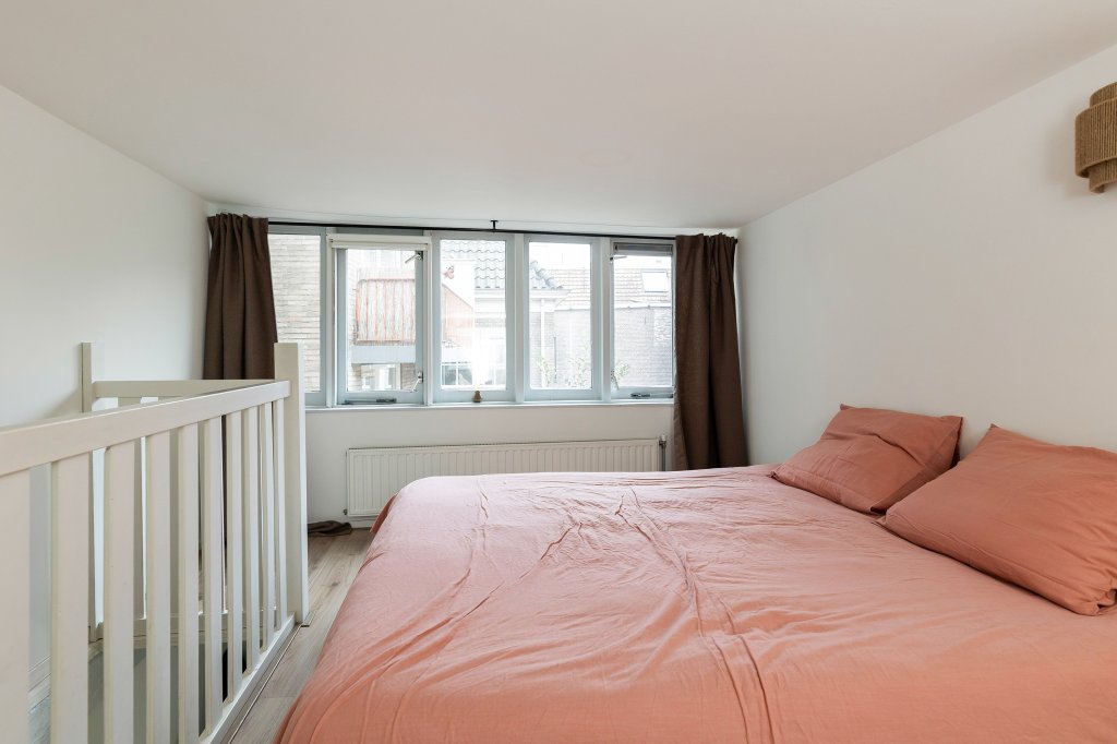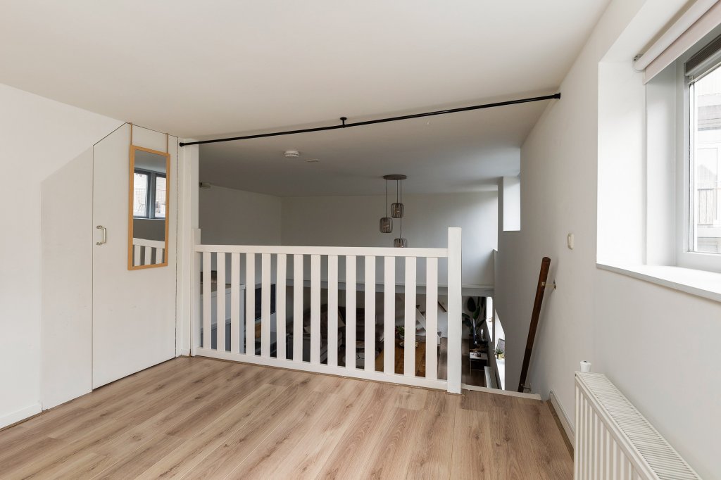 De moderne open keuken is praktisch ingedeeld en voorzien van alle gemakken, zoals een gaskookplaat, afzuigkap, combi-oven en vaatwasser. Onder de vide bevindt zich het gezellige zitgedeelte. Hier zorgen de karakteristieke balken en de intieme sfeer voor een knusse plek waar je heerlijk kunt ontspannen. Boven de keuken ligt de ruime en lichte slaapkamer, die een fijne en rustige privéplek vormt. Vanuit de woonkeuken bereik je nog een tweede vide. Deze ruimte is ideaal te gebruiken als werkplek, leeshoek of inloopkast. Hier vind je ook de CV-ruimte met mechanische ventilatie en extra bergruimte, evenals een handige inbouwkast. De eigen meterkast bevindt zich in de hal op de begane grond.