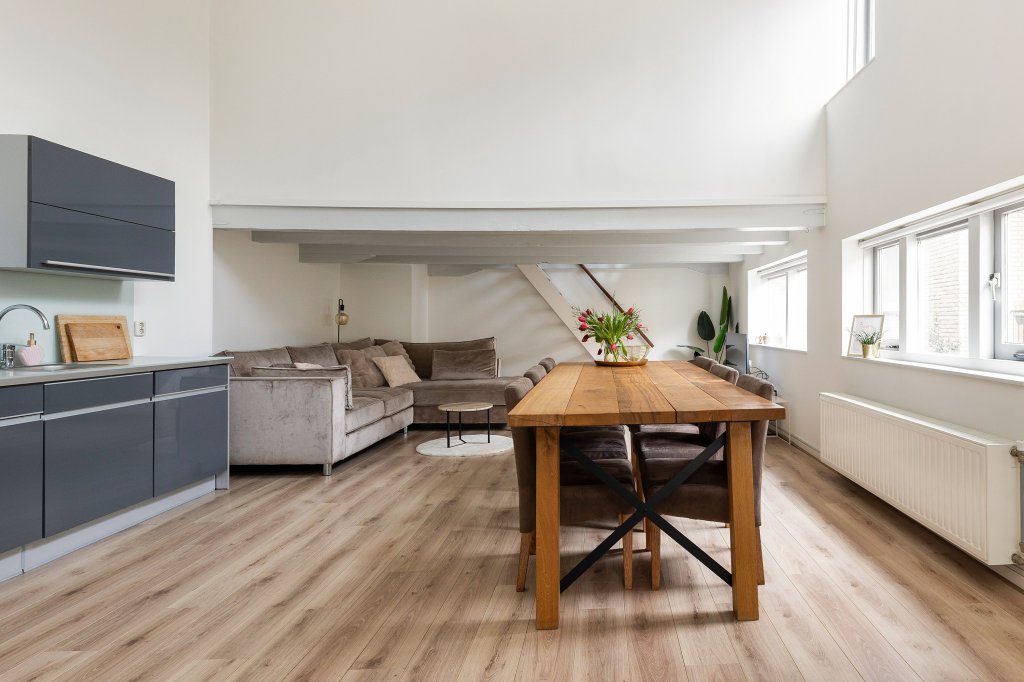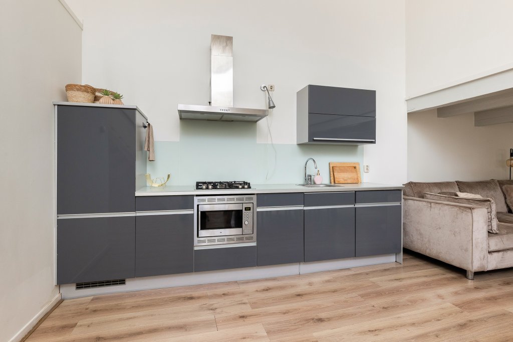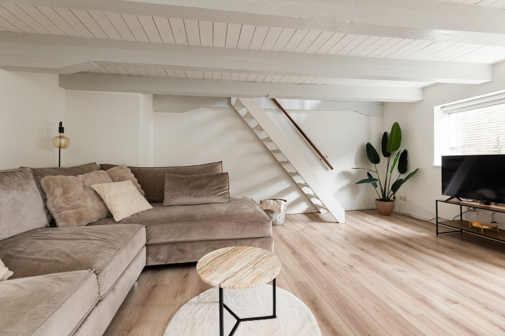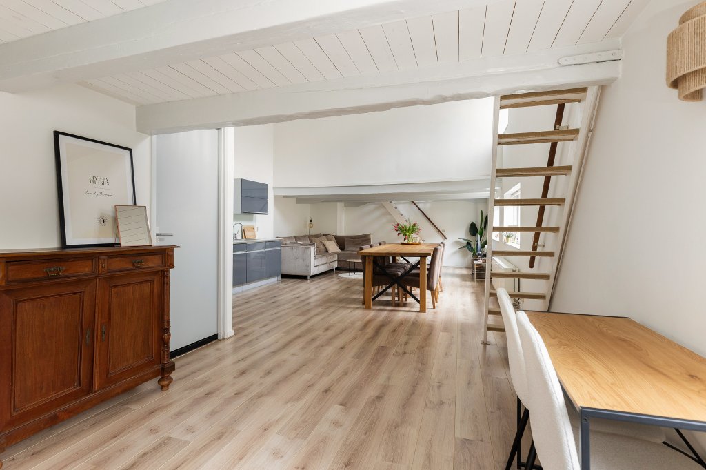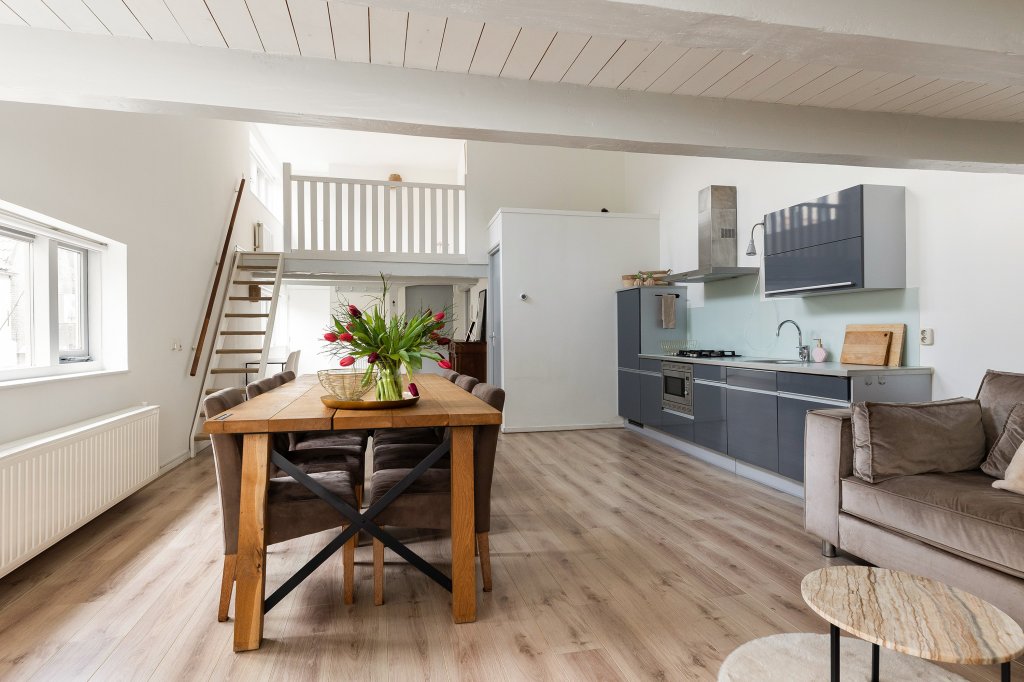 De moderne open keuken is praktisch ingedeeld en voorzien van alle gemakken, zoals een gaskookplaat, afzuigkap, combi-oven en vaatwasser. Onder de vide bevindt zich het gezellige zitgedeelte. Hier zorgen de karakteristieke balken en de intieme sfeer voor een knusse plek waar je heerlijk kunt ontspannen. Boven de keuken ligt de ruime en lichte slaapkamer, die een fijne en rustige privéplek vormt. Vanuit de woonkeuken bereik je nog een tweede vide. Deze ruimte is ideaal te gebruiken als werkplek, leeshoek of inloopkast. Hier vind je ook de CV-ruimte met mechanische ventilatie en extra bergruimte, evenals een handige inbouwkast. De eigen meterkast bevindt zich in de hal op de begane grond.