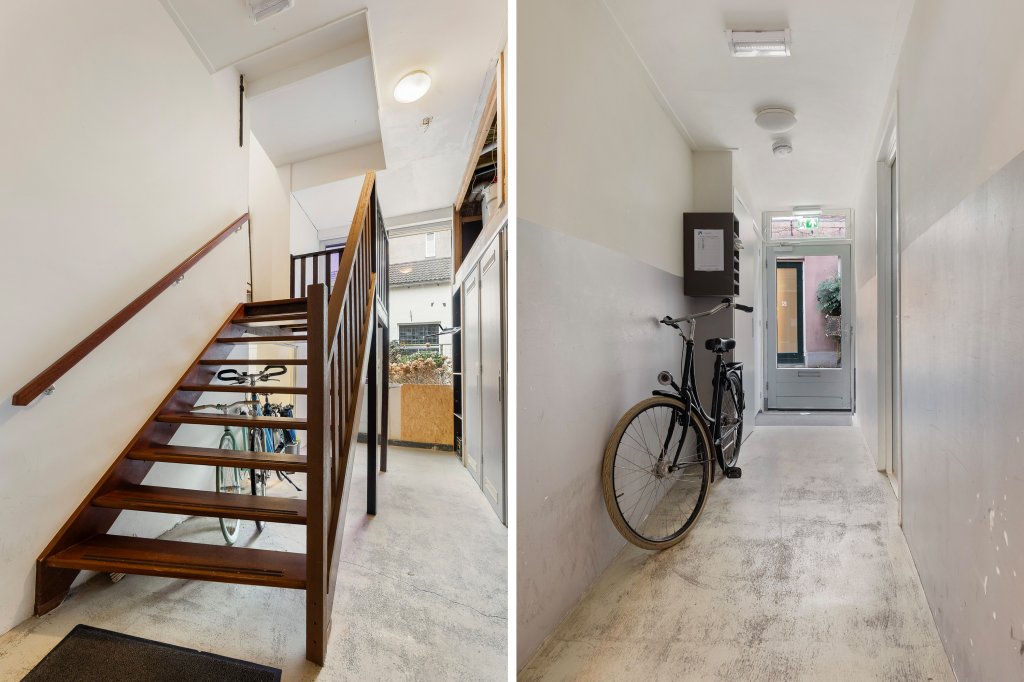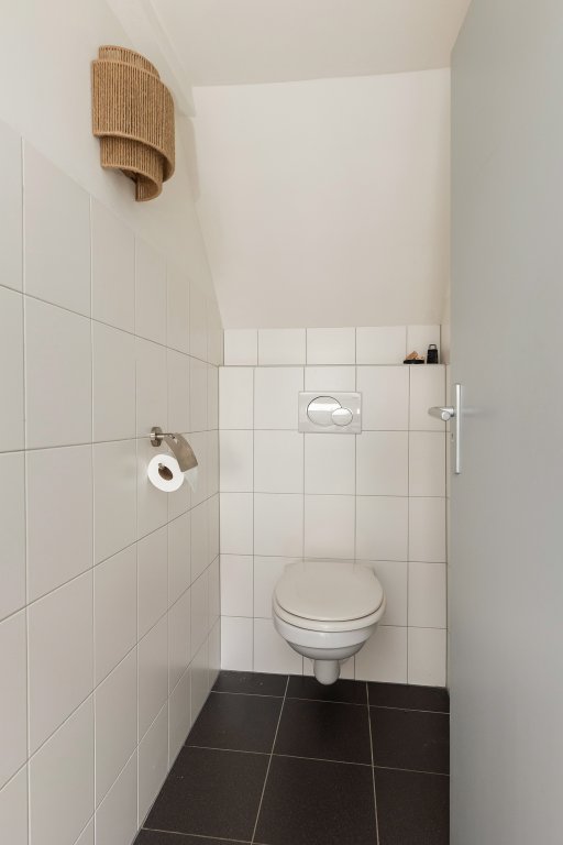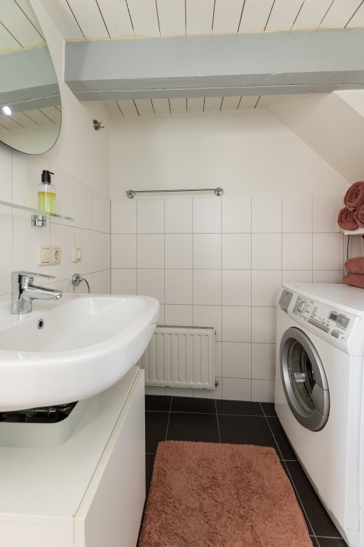 Via de gezamenlijke entree bereik je de voordeur op de eerste verdieping. Bij binnenkomst vind je aan de linkerkant het toilet en de nette badkamer, voorzien van een douchecabine en wastafel. Ook de wasmachine- en drogeropstelling bevindt zich hier.