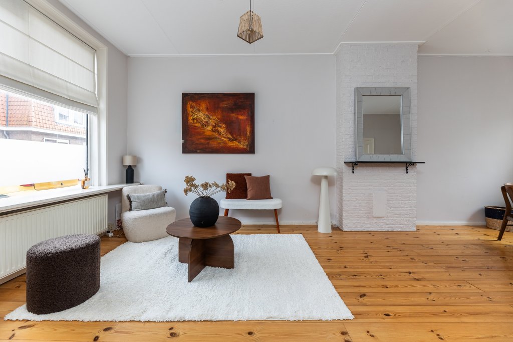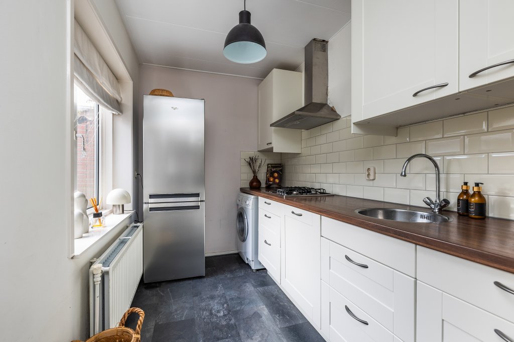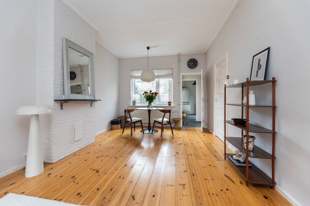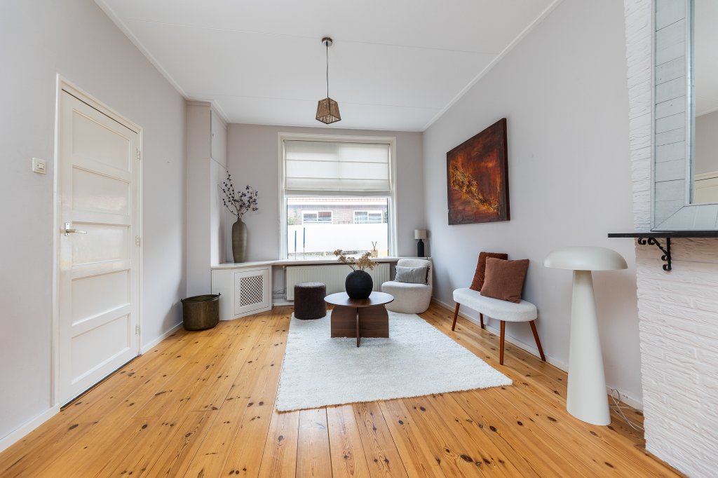 Binnen voelt het meteen warm en huiselijk. De lichte woonkamer met houten vloer creëert een fijne sfeer. Via een tussenhal – met garderobeplek, toilet én de deur naar de tuin – loop je door naar de keuken. Deze is netjes en praktisch, voorzien van gaskookplaat, afzuigkap, koelkast en wasmachineaansluiting.