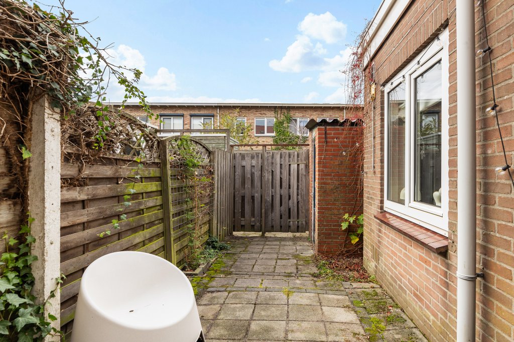 En dan is er nog de achtertuin: compact, onderhoudsvriendelijk en met achterom. Ideaal om buiten te zitten met een kop koffie in de ochtendzon. Achterin staat een stenen berging, handig voor fietsen of tuingereedschap.