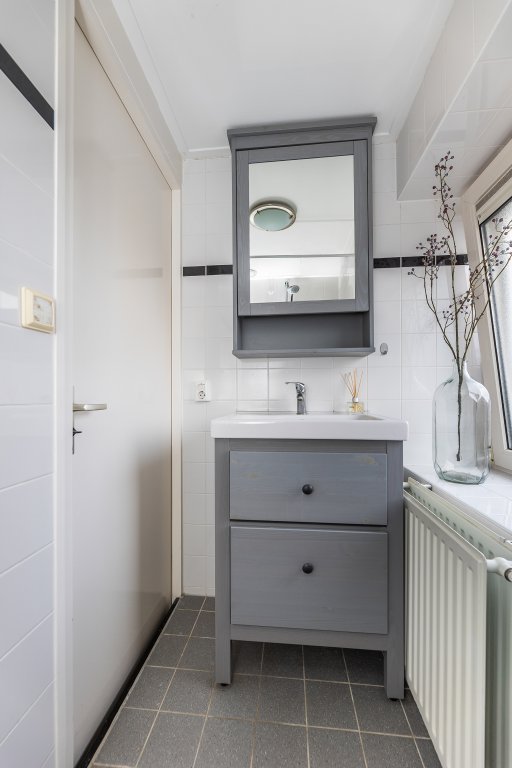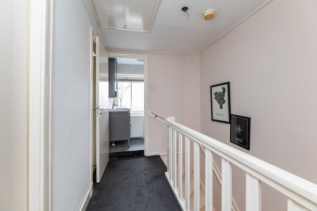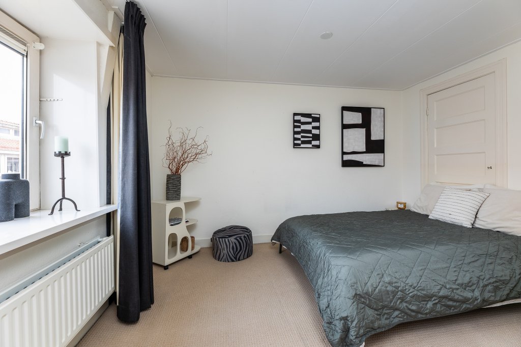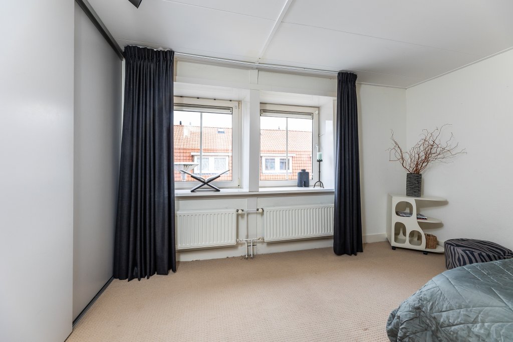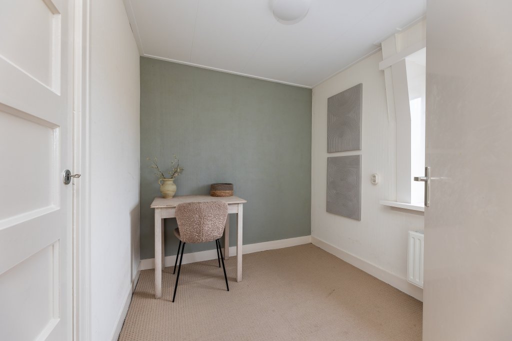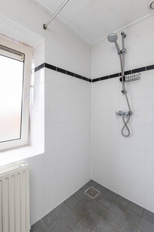 Op de eerste verdieping zijn twee slaapkamers, elk met hun eigen karakter en een inbouwkast. De badkamer is voorzien van een douche, wastafel, radiator en raam voor daglicht en ventilatie. Boven is er een ruime bergzolder, perfect voor koffers, seizoenspullen of om eventueel te verbouwen tot extra kamer.