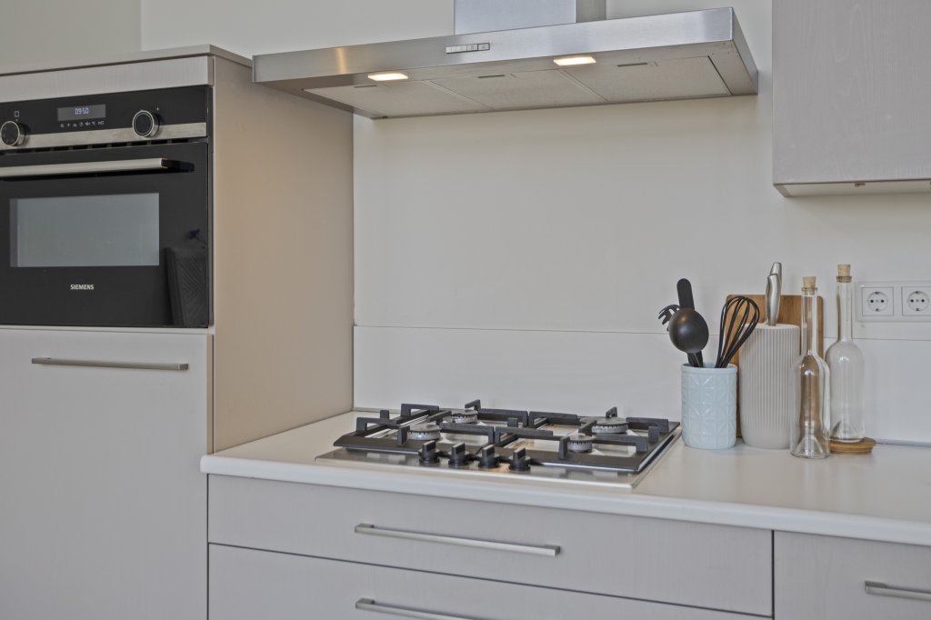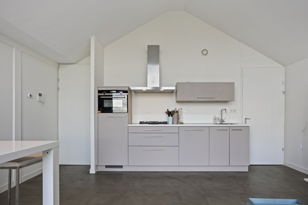 De woonkamer staat in directe verbinding met de moderne open keuken, uitgevoerd in een fraaie kleurstelling en compleet met gaskookplaat, afzuigkap, koelkast met vriesvak, combi-oven en vaatwasser. Vanuit de woonkamer bereik je bovendien de inpandige berging met wasmachine- en drogeraansluiting – praktisch en netjes weggewerkt.