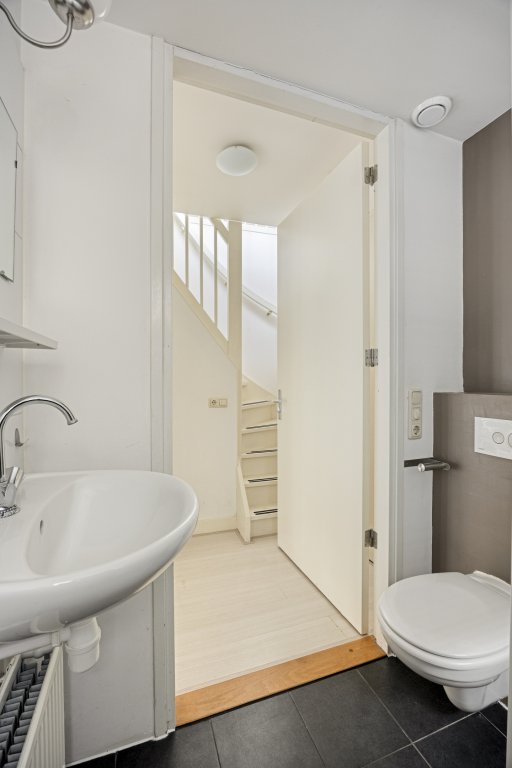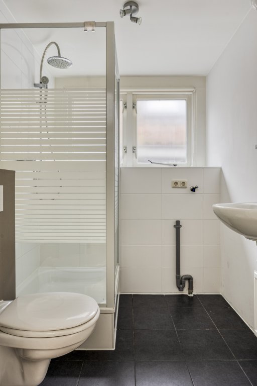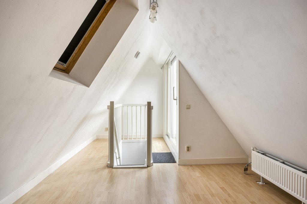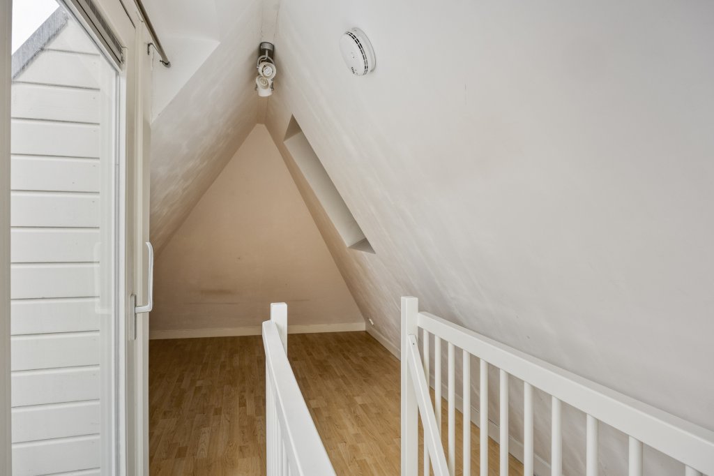 Boven vind je een knusse slaapkamer met karakteristieke schuine wanden en een dakraam dat zorgt voor een sfeervolle lichtinval. De badkamer is netjes en compleet met douche, wastafel en toilet.