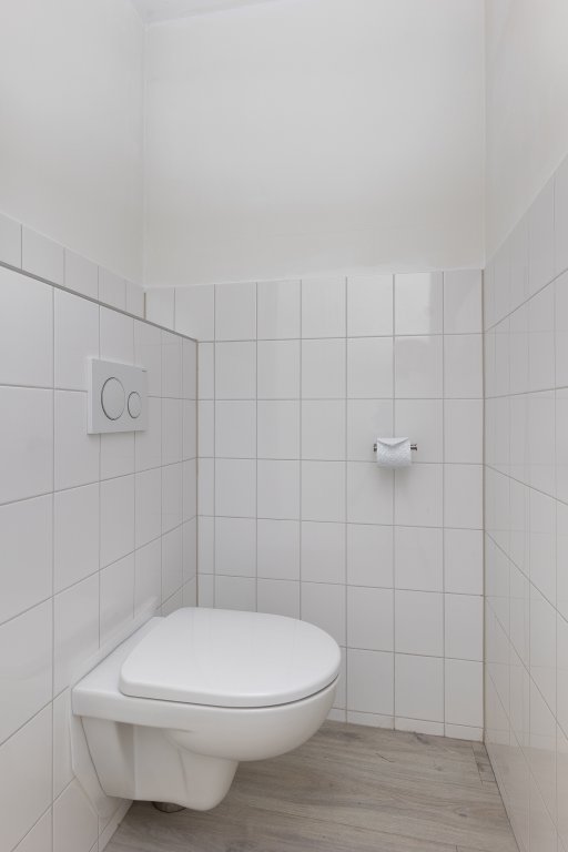 De badkamer is modern en praktisch ingedeeld met een inloopdouche, een wastafelmeubel en een designradiator. Het toilet bevindt zich apart van de badkamer, wat wel zo fijn is. De slaapkamer is ruim en biedt genoeg plek voor een tweepersoonsbed en een kast. Daarnaast is er nog een gedeelde berging aan de voorzijde beschikbaar voor extra opslag.
